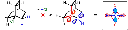 The importance of maintaining a planar configuration of the trigonal double-bond carbon components must never be overlooked. For optimum pi-bonding to occur, the p-orbitals on these carbons must be parallel, and the resulting doubly-bonded planar configuration is more stable than a twisted alternative by over 60 kcal/mole. This structural constraint is responsible for the existence of alkene stereoisomers when substitution patterns permit. It also prohibits certain elimination reactions of bicyclic alkyl halides, that might be favorable in simpler cases. For example, the bicyclooctyl 3º-chloride shown below appears to be similar to tert-butyl chloride, but it does not undergo elimination, even when treated with a strong base (e.g. KOH or KOC4H9). There are six equivalent beta-hydrogens that might be attacked by base (two of these are colored blue as a reference), so an E2 reaction seems plausible. The problem with this elimination is that the resulting double bond would be constrained in a severely twisted (non-planar) configuration by the bridged structure of the carbon skeleton. The carbon atoms of this twisted double-bond are colored red and blue respectively, and a Newman projection looking down the twisted bond is drawn on the right. Because a pi-bond cannot be formed, the hypothetical alkene does not exist. Structural prohibitions such as this are often encountered in small bridged ring systems, and are referred to as Bredt's Rule.