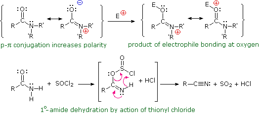 Amides are very polar, thanks to the n-π conjugation of the nitrogen non-bonded electron pair with the carbonyl group. This delocalization substantially reduces the basicity of these compounds (pKa ca. –1) compared with amines (pKa ca. 11). When electrophiles bond to an amide, they do so at the oxygen atom in preference to the nitrogen. As shown below, the oxygen-bonded conjugate acid is stabilized by resonance charge delocalization; whereas, the nitrogen-bonded analog is not. One practical application of this behavior lies in the dehydration of 1º-amides to nitriles by treatment with thionyl chloride. This reaction is also illustrated in the following diagram. Other dehydrating agents such as P2O5 effect the same transformation.