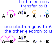 The use of these symbols in bond-breaking and bond-making reactions is illustrated below. If a covalent single bond is broken so that one electron of the shared pair remains with each fragment, as in the first example, this bond-breaking is called homolysis. If the bond breaks with both electrons of the shared pair remaining with one fragment, as in the second and third examples, this is called heterolysis.