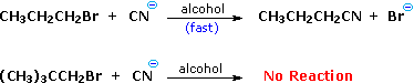 A. Reactant Structure: Variations in the structure of the reactant may have a marked influence on the course of a reaction, even though the functional group is unchanged. Thus, reaction of 1-bromopropane with sodium cyanide proceeds smoothly to yield butanenitrile, whereas 1-bromo-2,2-dimethylpropane fails to give any product and is recovered unchanged. In contrast, both alkyl bromides form Grignard reagents (RMgBr) on reaction with magnesium.