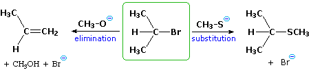 B. Reagent Characteristics: Apparently minor changes in a reagent may lead to a significant change in the course of a reaction. For example, 2-bromopropane gives a substitution reaction with sodium methylthiolate but undergoes predominant elimination on treatment with sodium methoxide.