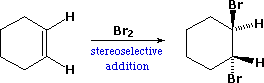 B. Stereoselectivity: If the reaction products are such that stereoisomers may be formed, a reaction that yields one stereoisomer preferentially is said to be stereoselective. In the addition of bromine to cyclohexene, for example, cis and trans-1,2-dibromocyclohexane are both possible products of the addition. Since the trans-isomer is the only isolated product, this reaction is stereoselective.