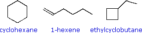 The three C6H12 isomers on the right illustrate this relationship. Cyclohexane is made up of six C-C sigma bonds and twelve C-H sigma bonds configured in a strain-free six-membered ring. The isomer having a double bond, 1-hexene, on the other hand, has four C-C single bonds (all sigma) and one C-C double bond (one sigma and one pi bond). Since the pi bond is weaker than a sigma bond, cyclohexane has a larger total bond energy (by nearly 20 kcal/mol) and is thermodynamically more stable than 1-hexene. The four-membered ring compound, ethylcyclobutane, has the same kinds of bonds as cyclohexane, but they are weakened by ring strain to such a degree that this isomer is even less stable (thermodynamically) than 1-hexene.