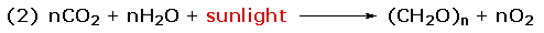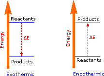 The sum of the product bond strengths in this case is greater than the sum of reactant bond strengths; consequently, the products are energetically (or thermodynamically) more stable than the reactants, and energy is released in the form of heat. Such reactions are called exothermic. It is helpful to think of exothermic reactions as proceeding from a higher energy (less stable) reactant state to a lower energy (more stable) product state, as shown in the diagram on the right. Reactions in which the products are higher energy than the reactants require an energy input to occur, and are called endothermic. Photosynthesis (equation 2) is an important example of an endothermic process. Energy in the form of photons (sunlight) drives the reaction, which requires chlorophyll as a catalyst.