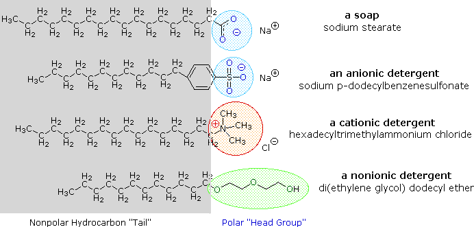 Alkali metal salts of fatty acids are more soluble in water than the acids themselves, and the amphiphilic character of these substances also make them strong surfactants. The most common examples of such compounds are soaps and detergents, four of which are shown below. Note that each of these molecules has a nonpolar hydrocarbon chain, the "tail", and a polar (often ionic) "head group". The use of such compounds as cleaning agents is facilitated by their surfactant character, which lowers the surface tension of water, allowing it to penetrate and wet a variety of materials.