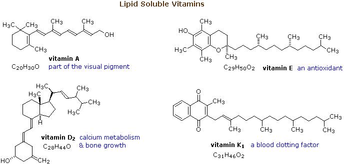 From the structures shown here, it should be clear that these compounds have more than a solubility connection with lipids. Vitamins A is a terpene, and vitamins E and K have long terpene chains attached to an aromatic moiety. The structure of vitamin D can be described as a steroid in which ring B is cut open and the remaining three rings remain unchanged. The precursors of vitamins A and D have been identified as the tetraterpene beta-carotene and the steroid ergosterol, respectively. Structures for these will be displayed by clicking on the vitamin diagram above.
