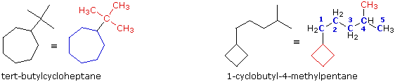 In the first case, on the left, we see a seven-carbon ring bearing a C4H9 substituent group. Earlier this substituent was identified as the tert-butyl group, so a name based on the cycloheptane root is easily written. In the second case, on the right, a four-carbon ring is attached to a branched six-carbon alkyl group. This C6H13 group could be named "isohexyl", but a better approach is to name this compound as a disubstituted pentane. The four-membered ring substituent is called a cyclobutyl group.