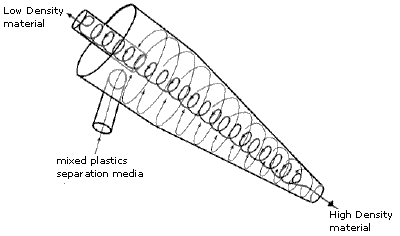 The plastic trash from most households, even with some user separation, is a mixture of unidentified pieces. Recycling of such mixtures is a challenging problem. A float/sink process has proven useful as a first step. When placed in a medium of intermediate density, particles of different densities separate-lower density particles float while those of higher density sink. Various separation media have been used, including water or water solutions of known density (alcohol, NaCl, CaCl2 or ZnCl2). As shown in the following table, the densities of common plastics differ sufficiently to permit them to be discriminated in this fashion. The cylindroconical cyclone device, shown on the right, provides a continuous feed procedure in which the material to be separated is pumped into the vessel at the same time as the separating media. Some polymers, such as polystyrene and polyurethane, are commonly formed into foamed solids that have a much lower density than the solid material.