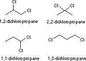 Since these compounds all have a three carbon chain, it should be clear that the number of structurally distinct carbon atoms must be either two or three. After all, there are two end carbon atoms and one in the middle. If the end carbons are different there will be a total of three different carbons; but if the end carbons are the same there will only be two different carbons. The same analysis applies to the number of structurally distinct groups of hydrogen atoms. Additional information about the hydrogen groups may be obtained from the splitting patterns (n+1 rule).