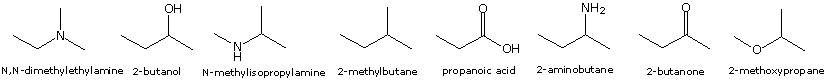 The line formulas and names of eight similarly sized and shaped compounds are shown below. Other than hydrogen, they are all composed of five heavier second row atoms, have molecular weights in the 72 to 74 amu range and have from 40 to 42 electrons. The boiling points of these compounds range from 28º to 141 ºC.