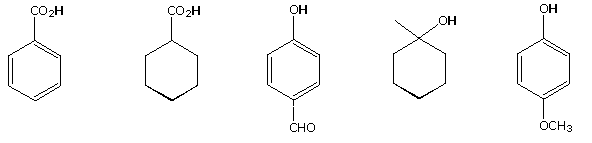 Five compounds incorporating acidic hydroxyl groups are shown below. Enter an estimated pKa for each of these in the designated answer box. . Answers will be judged correct if they are within 0.3 pKa units of the observed value.