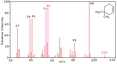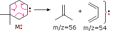 The mass apectra of three different saturated hydrocarbons are displayed below. Two are isomeric hexanes and the third is cyclohexane. Comments regarding the fragmentation patterns are presented in the box to the right of each spectrum. Ions are sometimes characterized by loss of a specific neutral fragment from the molecular ion. For example, a M-15 ion is identified as loss of a methyl group. Odd-electron ions, including the molecular ion, are colored orange when marked. Even-electron ions are colored magenta. The "Toggle Examples" button at the bottom will display a different set of spectra in which the influence of a particular functional group may be examined. Repeated clicking of this button will cycle through fifteeen spectra. In each example the molecular ion is designated by M •+.