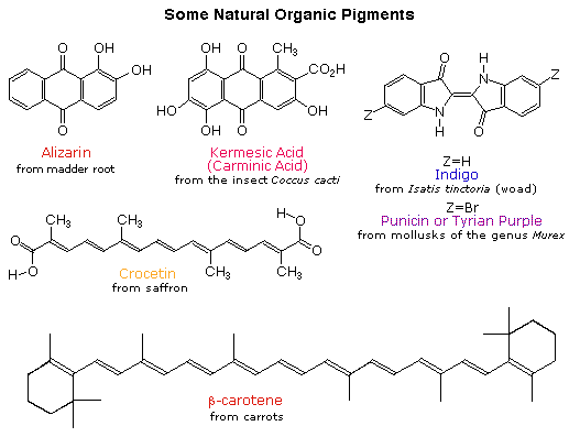Early humans valued colored pigments, and used them for decorative purposes. Many of these were inorganic minerals, but several important organic dyes were also known. These included the crimson pigment, kermesic acid, the blue dye, indigo, and the yellow saffron pigment, crocetin. A rare dibromo-indigo derivative, punicin, was used to color the robes of the royal and wealthy. The deep orange hydrocarbon carotene is widely distributed in plants, but is not sufficiently stable to be used as permanent pigment, other than for food coloring. A common feature of all these colored compounds, displayed below, is a system of extensively conjugated pi-electrons.