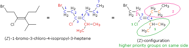 The line formula is expanded to give the structural formula in the center. The root name is heptene (the longest chain incorporating both carbons of the double bond), and the substituents (in red) are added to give the IUPAC name. In order to assign a configurational prefix the priority order of substituents at each double bond carbon must be determined. For carbon #3 the immediate substituent atoms are a chlorine and a carbon. The chlorine has a higher atomic number and therefore has higher priority (colored green and numbered 1). The more remote bromine atom does not figure in this choice. For carbon #4 the immediate substituent atoms are both carbons (colored orange). As a result, we must look at the next higher atomic number atoms in the substituent chain. These are also carbon, but the isopropyl group has two carbons (also orange) whereas the propyl group has only one. The priority order is therefore isopropyl (green) > propyl (magenta). Since the two higher priority groups (#1) are on the same side of the double bond, this configuration is (Z).