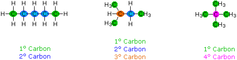When discussing structural formulas, it is often useful to distinguish different groups of carbon atoms by their structural characteristics. A primary carbon (1º) is one that is bonded to no more than one other carbon atom. A secondary carbon (2º) is bonded to two other carbon atoms, and tertiary (3º) and quaternary (4º) carbon atoms are bonded respectively to three and four other carbons. The three C5H12 isomers shown below illustrate these terms.