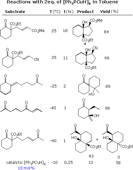 Since these reductions proceed to an intermediate Cu(I) enolate, the possibility of effecting an intramolecular aldol reaction subsequent to reduction offered an attractive variant. Five examples of this reaction sequence, using a stoichiometric (or larger) amount of reagent, are displayed in the following diagram. A sixth example at the bottom demonstrates that a catalytic version of the tandem reaction is possible.