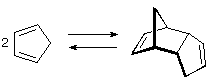 A similar Diels-Alder system that is more easily studied is the dimerization of 1,3-cyclopentadiene shown below. The ΔHº for this reaction is almost 10 kcal/mole lower than that of the butadiene + ethene addition, reflecting strain in the tricyclic product. The ΔSº, on the other hand, is roughly 10 eu less negative as a result of the fixed cisoid orientation of the diene.
