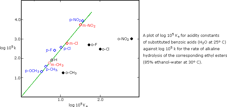 Now these differences in reactivity may be attributed to perturbations of ΔGº and/or ΔG by a combination of inductive, resonance and steric effects. If the same factors are responsible for the substituent effects in various different reactions, the rates and or equilibria should change in a proportional manner. Indeed, the exponential relationship of free energy to rate or equilibrium constants, as shown on the right, suggests that logarithmic plots should demonstrate this proportionality. To investigate this possibility, logarithms of the rate and equilibrium constants noted above for substituted benzoic acids and their ethyl esters were graphed as shown below. The data points are represented by small circles. It is immediately apparent that the rates and equilibria of the meta and para substituted compounds correlate well (the green line), but the ortho substituted compounds do not. This is not entirely unexpected, since the ortho substituents lie close to the reaction site and each may interact with different intermediates or transition states in many different ways. An analysis of factors that influence the acidity of ortho-substituted benzoic acids is presented elsewhere.