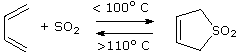 The direction taken by this reaction depends upon the temperature. Below 100º C the equilibrium favors the addition product, the standard heat of reaction being –16.5 kcal/mole. Above 100º C the cyclic sulfone decomposes to 1,3-butadiene. The equilibrium constant is close to unity at 100º C. If we assume this is true, the entropy change is easily calculated using the equations: