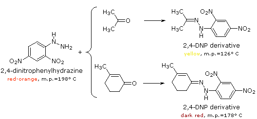 Another commonly used carbonyl derivative is prepared from 2,4-dinitrophenylhydrazine, as shown below. The reagent and its hydrazone derivatives are distinctively colored solids, which can be isolated easily. Saturated ketones and aldehydes are usually yellow to light orange in color. Conjugation of the carbonyl group with a double bond or benzene ring shifts the color to shades of red.