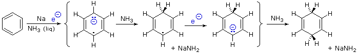 A facile reduction of benzene and substituted benzenes is achieved by treatment with the electron rich solution of alkali metals, usually lithium or sodium, in liquid ammonia. This reaction, which is called the Birch Reduction in honor of Australian chemist A.J.Birch, is related to the reduction of alkynes to trans-alkenes. Reduction is believed to occur by a stepwise addition of two electrons to the benzene ring, each electron addition being followed by a protonation, as illustrated in the following diagram. The initial electron addition gives a radical-anion for which many resonance contributors may be written. Following delivery of a proton by the weak acid ammonia, the resulting delocalized radical accepts a second electron to give an anion. The anion generated by the second electron addition is delocalized over three carbon atoms, and is protonated on the central carbon. The isolated (unconjugated) double bonds in the product do not react under these conditions.