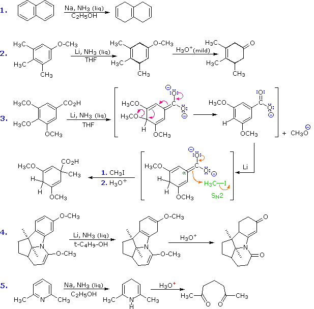 Further examples of Birch reductions are presented in the following diagram. The preference for protonation at unsubstituted sites (unless electron withdrawing groups are present), and for unconjugated products is again illustrated in the first reaction. Note that the isolated double bonds are not reduced at the low temperatures of refluxing liquid ammonia (–33 ºC). Reactions #2 & 4 illustrate a particularly useful application of the Birch reduction. Aryl ethers are reduced to 1,4-dienes, as expected, but one of the double bonds is an enol ether and is readily hydrolyzed to the corresponding ketone. If mild acid catalysis is used, the other double bond remains unchanged; more vigorous acid (or base) treatment shifts this double bond to a conjugated location if simple proton shifts permit. The 3rd reaction again illustrates the regio-directive influence of a carboxyl group, even in the carboxylate form. The alpha-anion is sufficiently stable that it may induce an elimination reaction (first stage) and upon regeneration be alkylated by a reactive alkyl halide (second stage). The last example shows the Birch reduction of pyridine to a bis-enamine, hydrolysis of which gives a diketone.