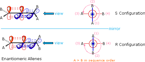 The above diagram shows an allene with different substituents (A & B) on each of the terminal (sp2) carbon atoms. The enantiomeric configurations are displayed relative to a mirror plane placed to illustrate their mirror-image relationship. To assign a stereochemical prefix, i.e. R or S, to these configurations we must view them from one end (it doesn't matter which), as shown in the Newman-like projection on the right. If the sequence order of substituents is A > B, then the two substituents nearest the viewer are assigned a ranking of 1 (A) and 2 (B), while the remote substituents are given rankings of 3 (A) and 4 (B). Applying the viewing rule then leads to the configurational notation shown above. This procedure may be used even when the A & B substituents on one sp2 carbon are different from those on the other sp2 carbon.