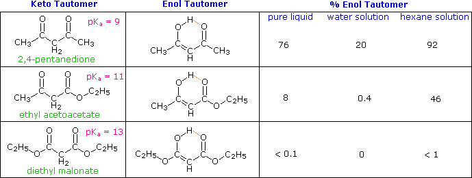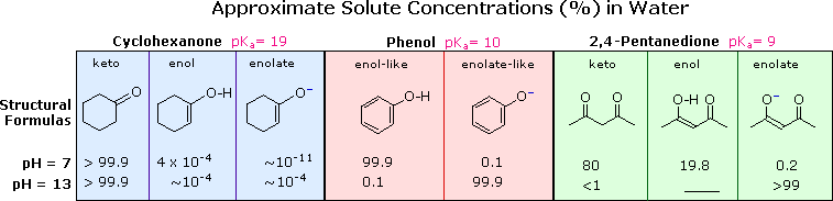Specific examples of enol tautomer and enolate anion concentrations for three different compounds are shown in the following table.