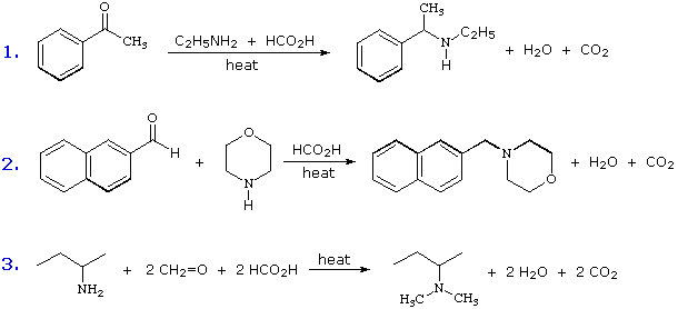 A useful procedure for the reductive alkylation of ammonia, 1º-, & 2º-amines, in which formic acid or a derivative thereof serves as the reducing agent, is known as the Leuckart Reaction. Some examples of this reaction are shown below.