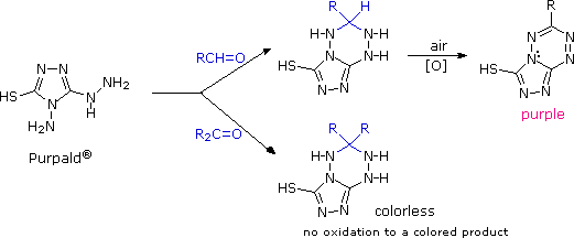 An interesting reagent that distinguishes aldehydes from ketones is the hydrazine derivative, 4-amino-3-hydrazino-5-mercapto-1,2,4-triazole, best known as Purpald (formula shown below). Although this reagent reacts with both aldehydes and ketones, only the aldehyde product is further oxidized to a purple, 10 π-electron aromatic heterocycle on exposure to air. Note that the pair of electrons on the nitrogen atom common to both rings is part of the π-electron system.