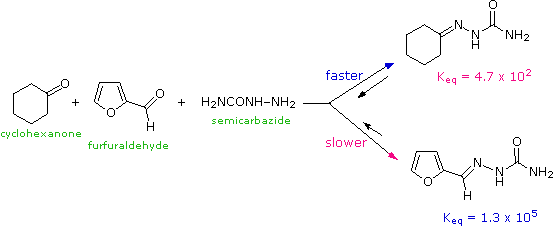 The semicarbazide reacts with cyclohexanone 60 times faster than it does with the aldehyde, and within 45 seconds a nearly quantitative amount of the semicarbazone derivative of cyclohexanone has precipitated and may be isolated by filtration. However, if the initial reaction mixture containing the cyclohexanone product is refluxed for a few hours an equally good yield of the more stable furfuraldehyde semicarbazone is obtained. Note that in both cases the semicarbazone derivative is favored over the initial reactants, but the equilibrium constant for the aldehyde is about 300 times greater than that of the ketone. The aldehyde semicarbazone is therefore the thermodynamically favored product, assuming there is equilibrium at all steps.