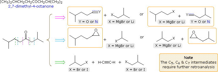 The useful approach of working out syntheses starting from the target molecule and working backward toward simpler starting materials has been formalized by Prof. E. J. Corey (Harvard) and termed retrosynthetic analysis. In this procedure the target molecule is transformed progressively into simpler structures by disconnecting selected carbon-carbon bonds. These disconnections rest on transforms, which are the reverse of plausible synthetic constructions. Each simpler structure, so generated, becomes the starting point for further disconnections, leading to a branched set of interrelated intermediates. A retrosynthetic transform is depicted by the => symbol, as shown below for previous examples 2 & 3. Once a complete analysis has been conducted, the desired synthesis may be carried out by application of the reactions underlying the transforms.