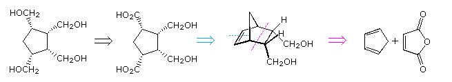 A careful examination of the tetracarboxylic acid target reveals a possible precursor in which the cis carboxyl groups at C1 and C4 are masked by incorporation in a double bond. Such a bicyclo[2.2.1]heptene structure is readily achieved from 1,3-cyclopentadiene by way of a Diels-Alder reaction, as shown in the following retrosynthetic disconnection. With this as a guide, a simple three step synthesis may be proposed (shown by clicking on the diagram). The borohydride workup of the ozonolysis in the last step will convert aldehydes to 1º-alcohols.