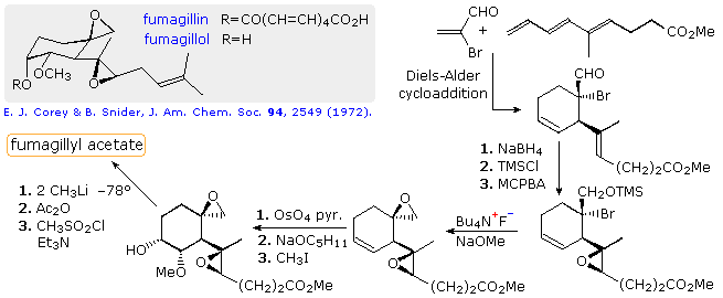 A good example of the first enhancement is the extraordinary selective control that is now possible for the aldol reaction. This may be demonstrated by considering two syntheses of the antiangiogenic natural product fumagillin. The structure of this compound is shown in the gray box at the upper left of the following diagram. Since fumagillin is easily prepared by esterification of the alcohol fumagillol with decatetraenedioic acid, this alcohol has been the target of numerous syntheses. A Diels-Alder cycloaddition would be an attractive first step toward the highly substituted cyclohexane ring in fumagillol, inasmuch as the rigidity of the ring permits good control of functional group location and configuration. Indeed, the first reported synthesis of fumagillol, by E. J. Corey (Harvard) in 1972, outlined in the diagram, follows this approach. The epoxidation of the side-chain double bond, shown on the right, was carried out at 0º and is remarkably selective in both location and configuration. Unfortunately, the dehydration of the terminal 3º-alcohol (last step) was less selective and gave appreciable amounts of the gem.-disubstituted double bond.