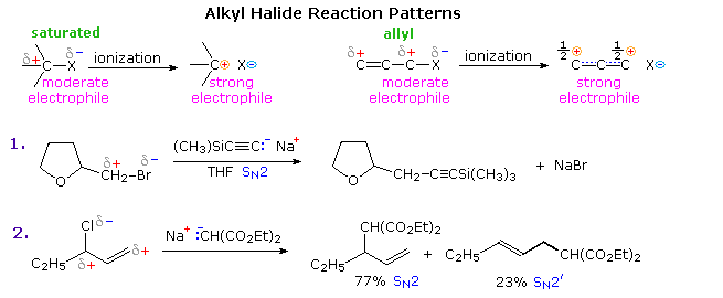 Alkyl halides are versatile synthetic intermediates, not only due to their electrophilic character, but equally because they may be converted to equivalent nucleophilic reagents in a single step. This will be demonstrated above by clicking on the diagram. Common organometallic compounds, such as Grignard and lithium reagents, add to the electrophilic carbon of a carbonyl group, as shown in equations 3 & 4. The resulting oxy salts are readily hydrolyzed to their stable conjugate acids. In the case of allylic metal compounds, electrophiles may bond at either the α or γ-carbon (equation 4), demonstrating the same alternation of reactivity observed for allyl cations.
