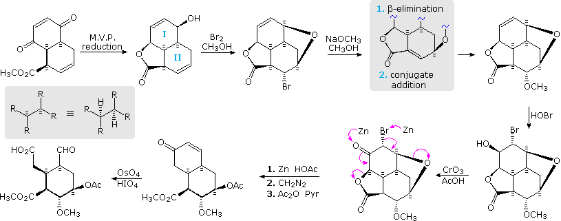The bicyclic carbon compound at the upper left is formed by a Diels-Alder cycloaddition of 1,4-benzoquinone with methyl trans-2,4-pentadienoate. Suprafacial endo addition fixes the relative configuration of the three stereogenic centers as two new carbon-carbon bonds are formed. The convex outer face of this molecule is more accessible (less hindered) to attack by reagents than is the inner concave surface; consequently hydride addition to the carbonyl groups takes place selectively as shown. Of the two disubstituted double bonds in the product, that in ring II is more reactive toward halogen electrophiles than that in ring I (note the electron withdrawing nature of the two oxygens on the latter). Thus, electrophilic bromine attacks the convex face of the ring II double bond, and the free hydroxyl group on ring I is ideally positioned to open the bromonium intermediate in a trans-diaxial fashion, forming a fourth (oxide) ring. Nucleophilic substitution of the resulting axial bromine by methoxide takes place with retention of configuration, and therefore must not be an SN2 reaction. An elimination-conjugate addition sequence (gray shaded box) accounts nicely for this result.